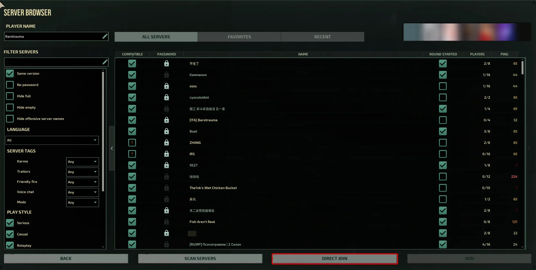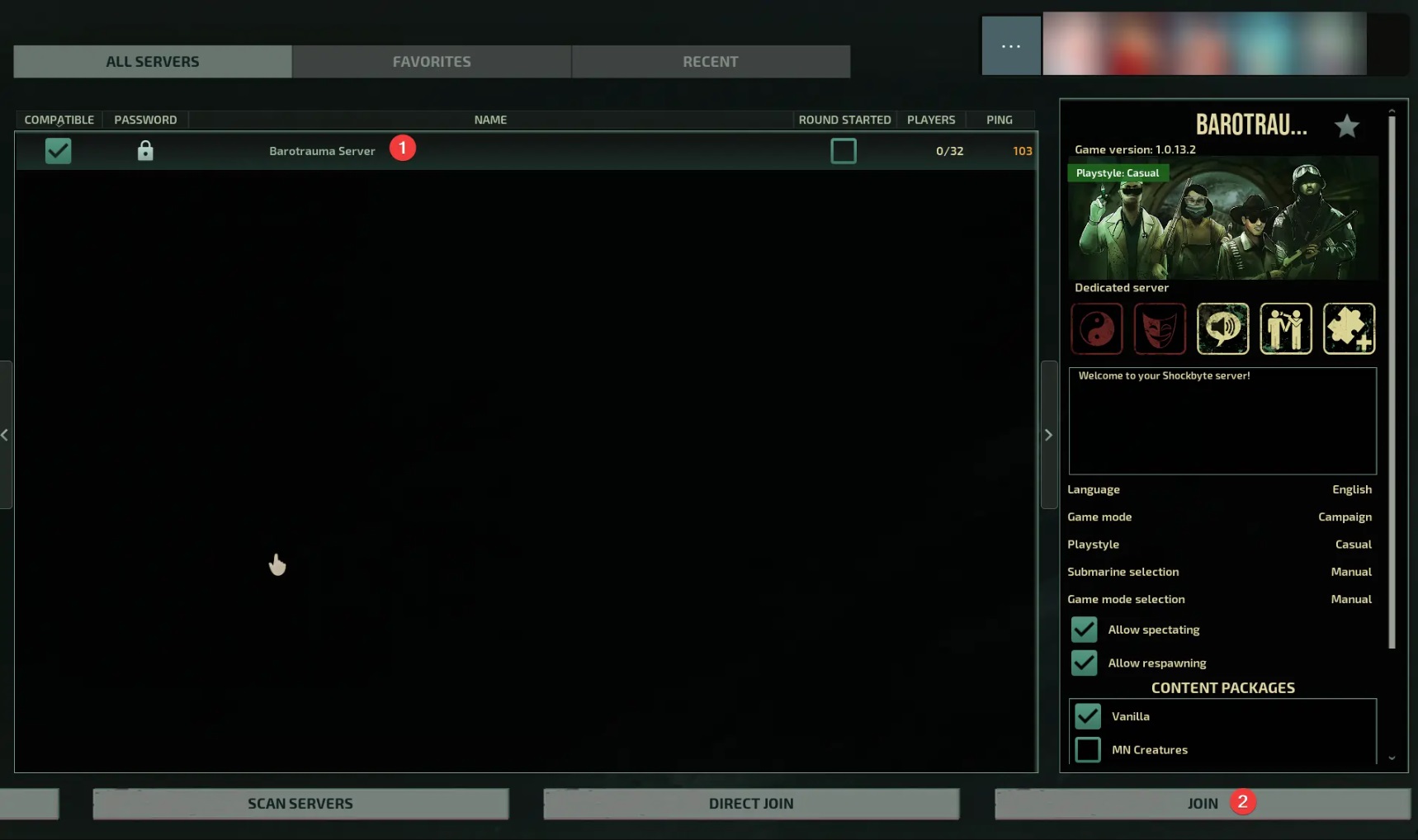 Как только ваш сервер Barotrauma настроен так, как вам нужно, вы готовы к подключению. Игроки могут присоединиться к серверам Barotrauma через Direct Connect или через внутриигровой список серверов.