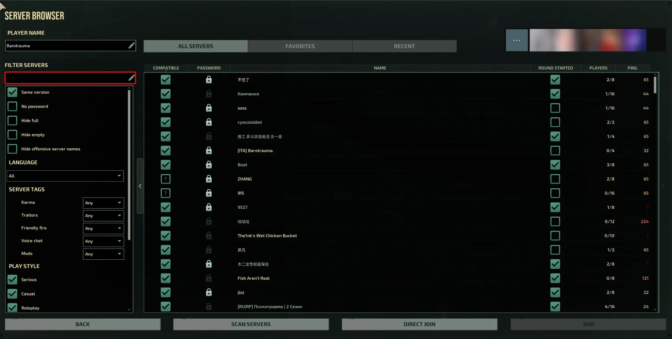 Браузер серверов — это внутриигровой список всех серверов Barotrauma. Вы можете воспользоваться функцией поиска в этом списке, чтобы найти нужный сервер по его названию.