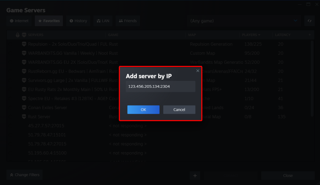 - Введите IP-адрес вашего сервера и порт запроса Steam (2304) , затем нажмите «ОК» .