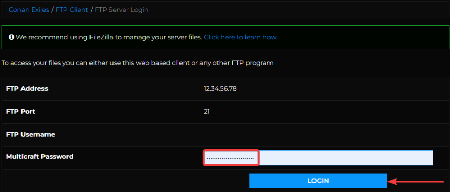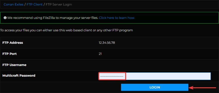 3. Введите  пароль Multicraft  и нажмите  «Войти» .