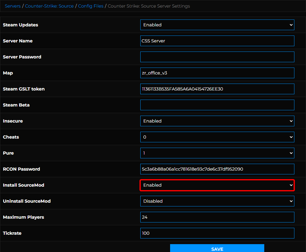 - Найдите параметр Установить SourceMod и установите для него значение Включено .
