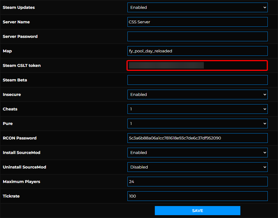 - Добавьте свой ключ к опции Steam GSLT Token .