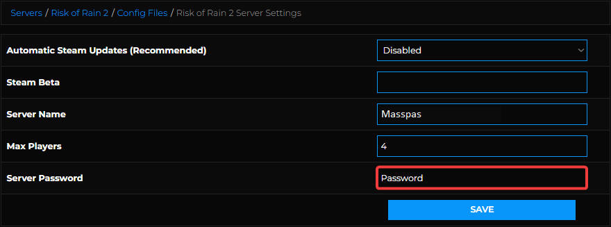Пароль сервера можно установить через файл свойств сервера Risk of Rain 2, расположенный на панели управления вашего сервера.