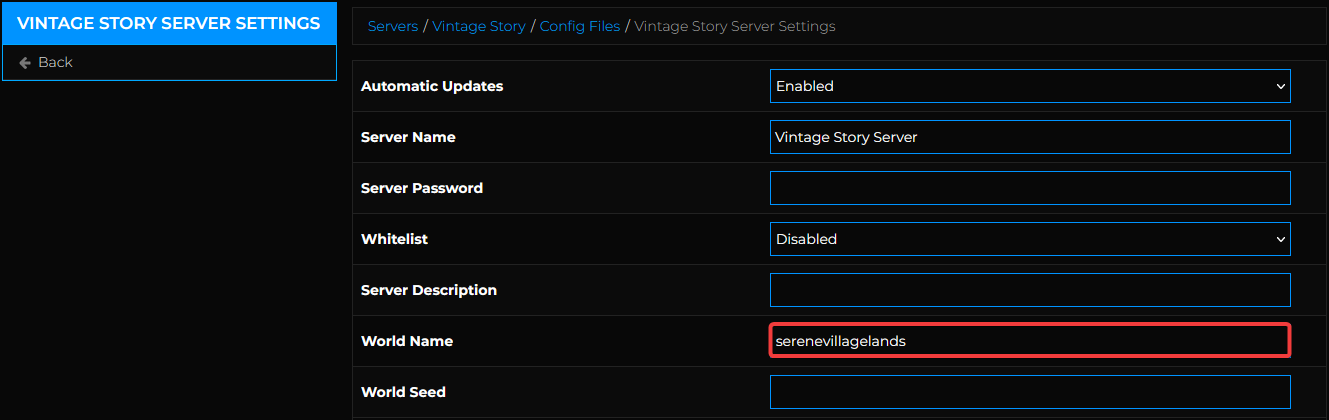 После загрузки файла сохранения вам необходимо настроить активный мир в разделе настроек сервера Vintage Story на панели управления вашего сервера.