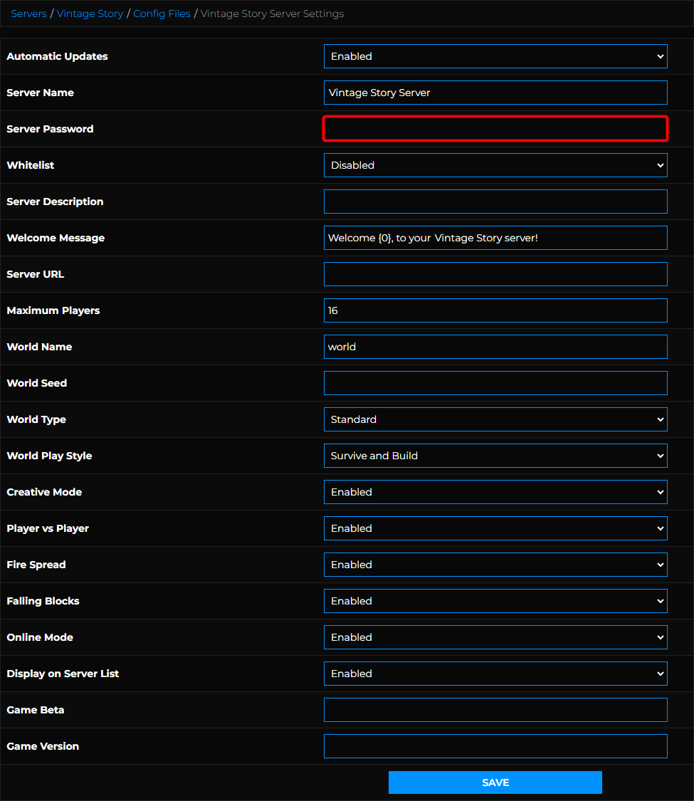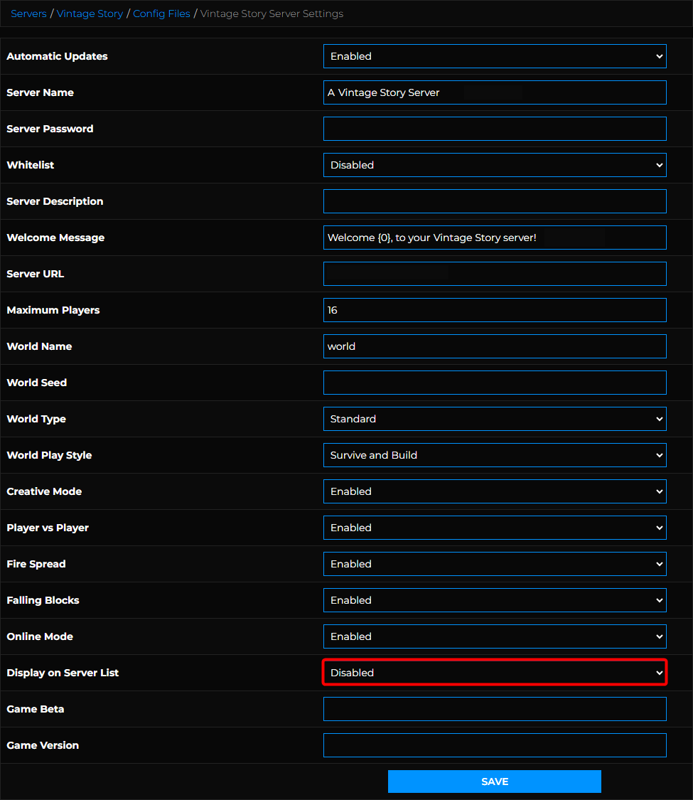 Вы можете добавить пароль или скрыть свой сервер из списка серверов в разделе «Настройки сервера Vintage Story» на панели управления.