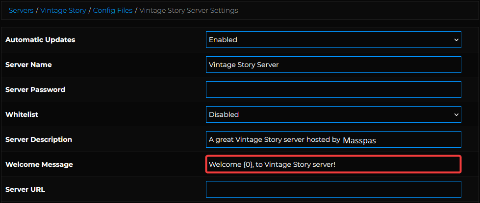 Вы можете изменить приветственное сообщение вашего сервера в разделе «Настройки сервера Vintage Story» на панели управления вашего сервера.